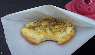- 駅のところの屋台村で、象の耳とかいうパンを売っていた。200円〜350円だし、軽く食べてみることにする。パンを焼く前に一度油で揚げてあるらしい。