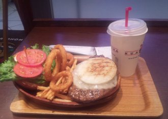 しかたないので、となりのKUA AINAというハワイアンバーガーの店に。アボガドはいいか、と思ったからチーズバーガーに。チーズは5種類あるということで、あまり濃いチーズは好きじゃないし、プロボローネとかいうのに。肉は1/3から1/2に。